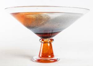 Kjell Engman, skål på fot, glas, Kosta Boda, ej signerad. Glasmassa i blått och orange med spräcklig dekor. Diameter 33, höjd 27 cm. Smärre slitage. Läs mer...