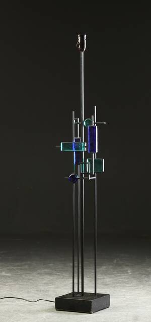 Svend Aage Holm Sørensen. Skulpturel standerlampe med fod af sortlakeret træ. Stel af sortlakeret jern monteret med farvet glas, H. inkl. fatning 126 cm. Fatning Läs mer...