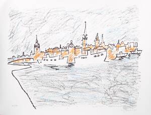 Färglitografi, Stockholmsbild. Signerat och numrerat. Daterat 80. Oramad. (Bladmått 62,5x48)