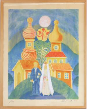 Färglitografi, bröllopspar. Signerat och numrerat. Daterat 1973. Inramat. Kant något fläckig. (68x53)