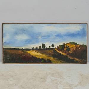 Oidentifierad konstnär. Ej signerad, landskap. Olja på pannå, yttermått inklusive ram: 73x154cm.