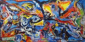 Niels Davernum. Komposition "Country lies open". Akryl på masonitplade. Sign. Davernum, Mål: 120 x 242 cm.