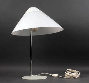 Hans J. Wegner 1914-2007. Bordlampe med stander og fod af hvidlakeret stål, skærm af hvidt akryl og top af hvidlakeret aluminium. H. 58 cm. Ø 42,5 cm. Designet 1973 til Hotel Scandinavia i København. Fremstillet hos Louis Poulsen. Denne vare er en udstillingsmodel fra Søborg Møbler. Brugsspor, ridser/mærker kan forekomme.