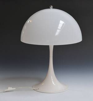 Verner Panton, bordslampa, "Panthella", Louis Poulsen. Vit akryl. Etikettmärkt "Louis Poulsen 123430 Made in Denmark". Skärmens diameter 51 cm. Höjd 70 cm. Obetydligt ytslitage. Ej Läs mer...