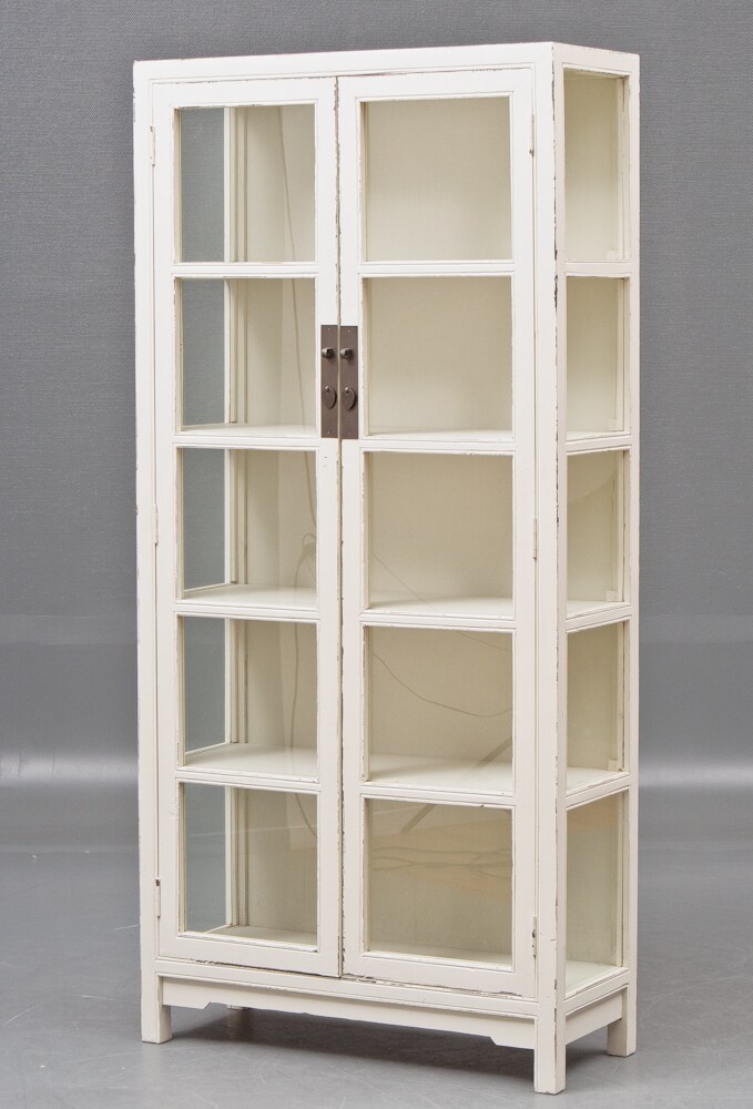 Vitrineskab, hvid antikbemalet. Front med to glaslåge, hvorbag fire Greb af patineret jern. Låsepind medfølger ikke. H. 197 cm. D. 38 cm. B. 93 cm. Modelfoto. Fremstår i original emballage. dia014CC OBS! Venligst vær opmærksom på at denne vare befinder sig på Lauritz.com Herlev’s eksterne lager på Rovsingsgade 68, 2100 København Ø og kan UDELUKKENDE besigtiges og afhentes på denne adresse tirsdage mellem kl. 12-18.