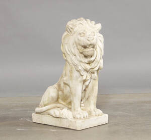 Haveskulpturer. Stor løve af hvidmalet støbt kunstmatriale. ca 250 kg. H. 96 L. ca. 85 B. 40 cm. Fremstår med slitage, afslag og afskalninger. Obs: Läs mer...