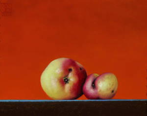 'To' ( 2 æbler). Niels Erik Skovballe 2011. Signeret monogram 2011 og betitlet på bagsiden. Olie på plade. 18 x 23 cm. (25 x 31 cm) Skovballe var i gang med kultursociologiske studier ved Københavns Universitet, da han i 1969 havde sin debutudstilling på Norberg i Sverige - og herefter valgte at fokusere på billedkunsten. Han har sidenhen bl.a. udstillet på Den Frie, Kunstnernes Efterårsudstilling i 1976 og 1998, Kunstnernes Sommerudstilling i 1998-2000, på Marienlyst Slot i 2003, 2006 og 2007, samt på museer og gallerier. Skovballe har fortrinsvist dyrket det naturalistiske formsprog, og i de sidste årtier har stilleben-genren optaget ham meget. "Ved betragtning af disse opstillinger aner man, at den umiddelbare glæde ved smukke, harmoniske kompositioner ofte er for lidt for kunstneren og at traditionen med indholdsmæssig overdådighed måske er for meget. Et sted mellem disse yderligheder er der ved hjælp af få, nøje udvalgte billedelementer, tilføjet en diskret symbolik, så man a