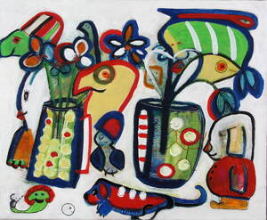 Ejna Vejlgaard f. 1951. Akryl på lærred. Figurativ komposition. Signeret Ejna. Mål: 49,5 x 59,5 cm, (54,5x65).