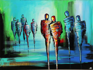 Saline Døg. Figurkomposition. Akryl på lærred. Sign. monogram. Uindrammet. 90 x 120 cm.