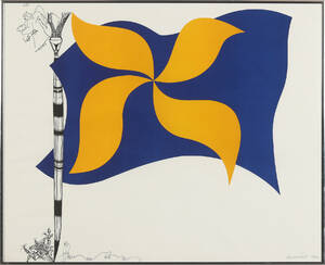 Litografi, 85/200. Komposition med flagga. Dagmått 53x66 cm. Ej examinerad ur ram.