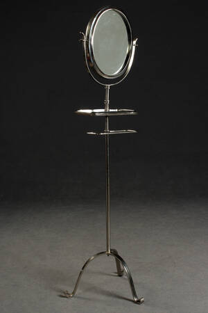 Spiegel auf Ständer. Spiegel-Ständer, mit ovalem Spiegel, darunter Ablagefläche und Handtuschhalter, auf Dreifuß, silberfarben. Maße: H 166, Dm 40, Spiegel 30x41. Mit leichten Gebrauchsspuren.