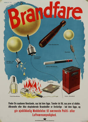 Oplysningsplakat, Brandfare tegnet af Henry C. , udsendt af Justitsministeriets Propagandaudvalg under besættelsen, litografisk trykt hos Egmont H. Petersen, København 1943. 85 x 61,5 cm. Uden ramme. Fremstår med taperester i hjørnerne. Plakaten er en del af temaauktionen Plakatens guldalder - en omfattende samling af vintageplakater, som i januar og februar sælges hos Lauritz.com Vejle.