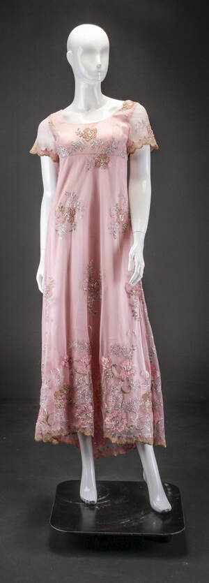 Elyse, Versailles, rosa selskabskjole af perlebesat tyl og satin. L. ca. 125, str. 34. Fremstår med kraftig slitage, reparation er nødvendig. Läs mer...