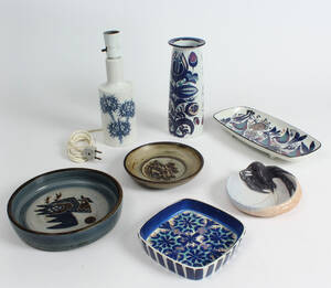 Royal Copenhagen vase, bordlampe samt diverse fade i porcelæn og fajance, signeret blandt Knud Kyhn og Jørgen Mogensen, H. 25-29 cm. (7)
