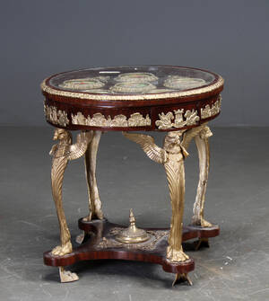 Rundt bord af fineret træ, rigt dekoreret med messing ormolu, bordplade af glas hvorunder plaketter af trykt papir med romantiske motiver. H. 70 Ø. 67 cm. Fremstår med afskalninger, lette brugsspor, finerskader.