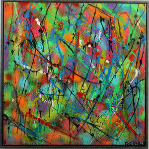 Allan Vonsild f. 1961. Komposition, akryl på lærred, sign. og dateret på bagside. 80x80 cm. (84x84 cm.) Allan Vonsild er autodidakt kunstner, der har malet siden 2008. Allans værker er primært store billeder malet i abstrakt stil med stærke farver.