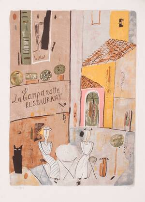 "Brasserie Salya" Madeleine Pyk Född 1934 Signerad: M Pyk Numrerad: 69/275 Mått bildyta: 41 x 41 cm Mått med ram: 60,5 x 58,5 cm Konditionsrapport: Läs mer...
