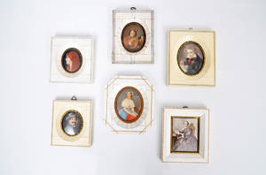 MINIATYRER, 4 st, 1900-talets början, bemålade tryck, bl.a. föreställande Jenny Lind, ramar i ben, ramarnas storlek ca 11,5x10,5 cm. 894967. Läs mer...