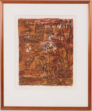 Komposition med tigrar Madeleine Pyk Född 1934 Signerad: M Pyk Mått bildyta: 31 x 22 cm Mått med ram: 52 x 42 cm Konditionsrapport: Mindre Läs mer...