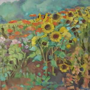 Oljemålning 'blomsteräng', oidentifierad konstnär