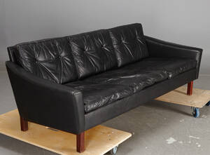 Soffa, 1960-tal. Tresitssoffa. Klädsel av svart skinn. Lösa plymåer. Benställning i betsad bok. Höjd 69 cm, längd 208 cm, sitthöjd 40 cm. Gavel med mindre tryckmärken. Litet hål i sittkudde.