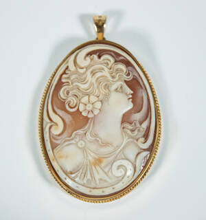 BROSCH/HÄNGE, 18 k guld, kamé, skuret snäckskal föreställande klassisk kvinnoprofil, spiralvriden kantdekor, Hultman A/B J L, Stockholm 1947, höjd ink. ögla 5,2 cm, total vikt Läs mer...