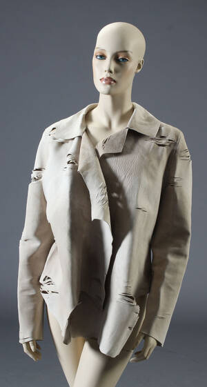 Mie Vinther. Jakke af kvæg skind og ruskind. Str. 36.Om jakken siger designeren: "Mit univers handler om det uperfekte. Det handler om at fange skønhed i fejl. Fraktionerne i jakken er et udtryk for angst. En frygt for, at alt der er i bevægelse går for stærkt og kommer ud af kontrol. Jeg arbejder med en blanding af det skrøbelige og det rå, til både at vise og manipulere det menneskelige legeme. Silhuetten er løs, alligevel elegant, og farverne er nøgne og delikate".Hele beløbet (hammerslag, gebyr og salærer) går ubeskåret til Scleroseforeningen. Lauritz.com donerer således både køber- og sælgersalær.