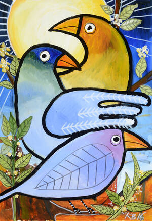 Kirsten Brok. Akryl på lærred. Komposition med fugle