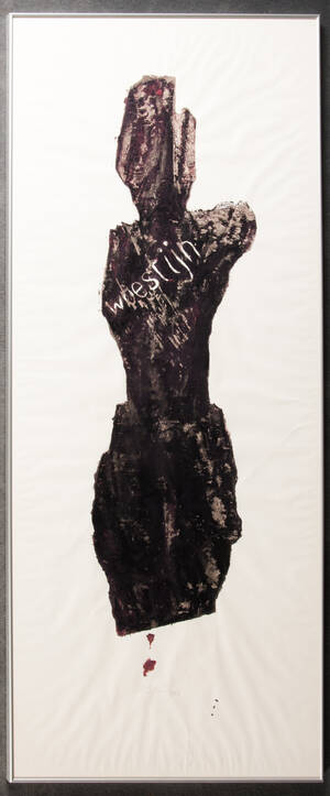 Felix Droese, Woestijn, 1986. Holzdruck, Öl und Wattschlick. Signiert und datiert. Maße: 150 x 90. Hinter Glas gerahmt.