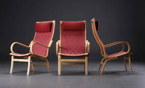 Finn Østergaard. Tre højryggede hvilestole, model Albert, stel i formspændt bøg, udspændt med lyse gjorde samt nakkehynde betrykket med bordeaux stof. Fremstår med slid på gjorde; falmede. (3)