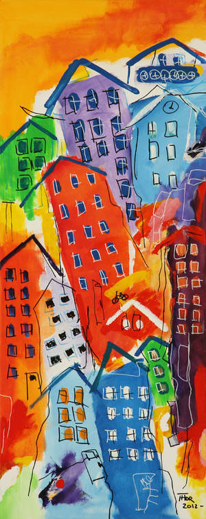 Thor Hansen. Komposition med huse. Akryl på lærred. Sign. Thor - 2012. 100 x 40 cm. Uindrammet.