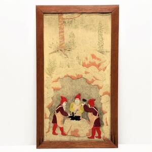 Broderad med s.k. pekin knot även kallat forbidden stitch, motiv av figurscener i trädgård med fjärilar och blommor mot röd botten. Vit bård broderad med Läs mer...
