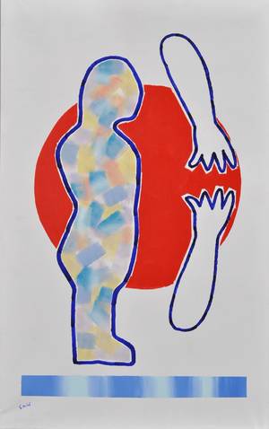 Hardy Strid. Akryl på lærred. 'Tricket', sign. Strid, 122 x 88 cm. Registreret som nr. 13695 i kunstneres register 2004. Hardy Strid er svensk maler og grafiker med bopæl i Tiarp uden for Halmstad. Hardy Strid har siden 1953 arbejdet med abstrakte opstillinger, landskaber og figurkompositioner. Under sin studietid på Valand i Gøteborg fra 1948-1952 var Hardy Strid stærk påvirket af sin lærer André Nemes, og som kunstner har Hardy Strid været i konstant bevægelse, i forsøget på at finde inspiration. I fyrrene var hans kunst stærkt inspireret af kubismen. Sidenhen i halvtredserne af det ydre rum og rumfart. I tresserne var Hardy Strids motivverden stærkt fokuseret omkring miljøspørgsmål samt krig og ufred i verden. Fra halvfjerdserne og til i dag har hans kunst været præget af stærke klare farver, og hans motivverden er fokuseret omkring enkeltheden. I sit kunstnerliv har Hardy Strid udført ca. 15.000 malerier samt en del grafik. Alle værkerne er registreret i nummerorden i ha