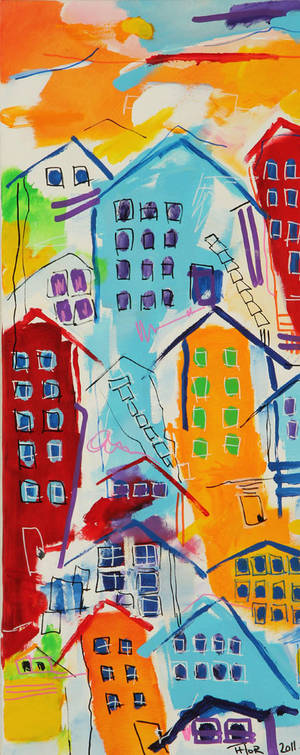Thor Hansen. Komposition med huse. Akryl på lærred. Sign. Thor - 2011. 100 x 40 cm. Uindrammet.