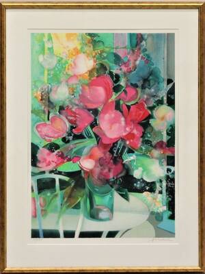 Blomsterstilleben, litografi, oidentifierad konstnär, 107/175, 48 X 68 cm