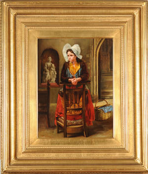 Engelsk kunstner. Kirkeinteriør med ung pige knælende på prie dieu, olie på lærred, sign. C. Brightwell og dat. 1869, 46,5 x 35,5 cm. Fremstår restaureret, samt med retoucheringer.