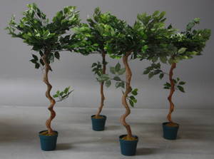 Fire stuebirke med stammer af balsameret træ, kviste og blade af kunstmatriale. H. 120 cm. Alle stående i krukke af kunststof. (4)