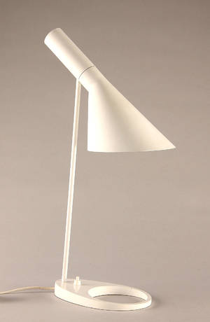 Arne Jacobsen. AJ-bordlampe af hvidlakeret metal, foden med hvid trykafbryder. Fremstillet hos Louis Poulsen. H. 55 cm. Fremstår med brugsspor. Denne vare er en del af et tema over belysning fra 1920?erne ? 1950?erne hos Lauritz.com i Næstved i perioden 12-27. maj. Spørgsmål omkring varen kan stilles direkte til larsj.nastved@lauritz.com Lamperne opbevares i auktionsperioden i sikret boks og det anbefales at aftale tid til eftersyn.