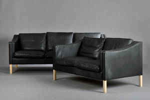 Stouby. To og tre-pers. sofa model Eva, ben af bøgetræ, ryg, sider og løse hynder betrukket med sort læder, H. 80 L. 138/198 D.85 Sh. Läs mer...