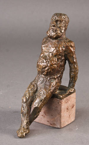 Hanne Varming: Siddende herre. Skulptur af bronze opsat på piedestal af sten. Usign. H. 23. (2)