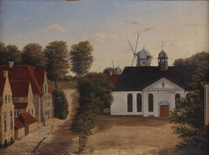 Ubekendt kunstner: Parti af Kastellet i København med Kastelskirken; i baggrunden møllerne på Kastelsvolden. Usign. Betegnet på blændrammen: "Malet af Kommandør (...) Ipsen", Olie på lærred. 32,5 x 42,5 cm (38 x 49 cm). Fremstår med krakeleringer.