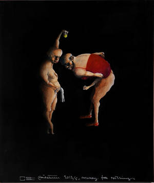 'Money for nothing', 2012. Poul Steen Olie og akryl på lærred. Sign. Poul Steen 2012/5 samt sign. monogram med ægyptiske hieroglyffer. 94 x 79 cm. Uden ramme. I arbejdet med maleriet, har Poul Steen været igennem alle ismerne. Der er ingen tvivl om, at han i sit arbejde er meget inspireret af barokkens mestre som f.eks. Caravaggio og fra det 20. århundredes malerkunst den gådefulde Francis Bacon med sine monumentale billeder af menneskekroppen, men Poul Steen finder også inspiration i hverdagens skæve personer, humor og små finurligheder, som ofte giver et surrealistisk udtryk hvor kunstneren udforsker sit eget ubevidste og viser dette igennem sin kunst.