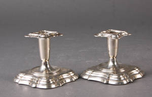 Et par udfyldte stager med ligeknækket profileret korpus. Stemplet 830S. H. 9 cm. Ene trykket foroven. (2)