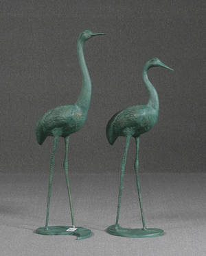 Par skulpturer i grønpatineret aluminium i form af traner. H. 98/112cm. (2)