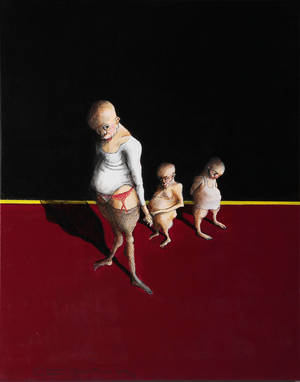 'Vores underlige mor', 2012. Poul Steen Olie og akryl på lærred. Sign. Poul Steen 2012/5 samt sign. monogram med ægyptiske hieroglyffer. 98 x 77 cm. Uden ramme. I arbejdet med maleriet, har Poul Steen været igennem alle ismerne. Der er ingen tvivl om, at han i sit arbejde er meget inspireret af barokkens mestre som f.eks. Caravaggio og fra det 20. århundredes malerkunst den gådefulde Francis Bacon med sine monumentale billeder af menneskekroppen, men Poul Steen finder også inspiration i hverdagens skæve personer, humor og små finurligheder, som ofte giver et surrealistisk udtryk hvor kunstneren udforsker sit eget ubevidste og viser dette igennem sin kunst.