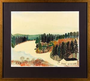 Skogslandskap med stuga. Monogramsignerad: PMP Mått bildyta: 36 x 29 cm Konditionsrapport: Fläckar, Mindre gulnat papper, Mindre slitage på ram, Inga övriga anmärkningar. --------------------- Primus Mortimer Pettersson 1895-1975 Gouache on paper Forest landscape with cottage. Monogram signed: PMP Dimensions of image area: 36 x 29 cm Conditional report: Stains, Minor yellowed paper, Minor wear on frame, No other remarks.
