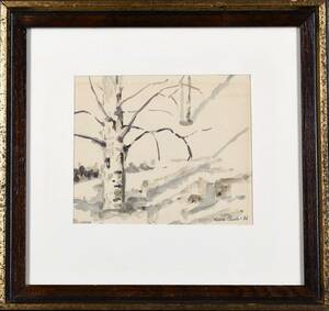 Komposition med björkar Signerad: Lars Pirak Daterad: 1973 Mått bildyta: 16 x 13,5 cm Konditionsrapport: Inga anmärkningar ------------------------- Lars Pirak 1932-2008 Watercolor on paper Composition with birches Signed: Lars Pirak Dated: 1973 Dimensions of picture area: 16 x 13,5 cm Condition report: No remarks