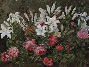 Ubekendt kunstner: Komposition med roser og liljer. Sign. monogram. Olie på lærred. 60 x 80 cm. U.r.