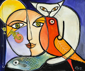 Kirsten Brok (f. 1939). Komposition med kvinde, kat og fugl.Akryl på lærred, sign. og dat. KB 19. 100 x 100 cm. UR Läs mer...