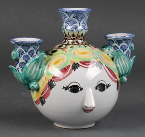 Bjørn Wiinblad 1918-2006. Tre-armet lysestagee i form af kvindeansigt, dekoreret med polykrom glasur, midterste lysarm med gennemgående hul til vasebrug. Sign. monogram BW, dat. 86, Läs mer...